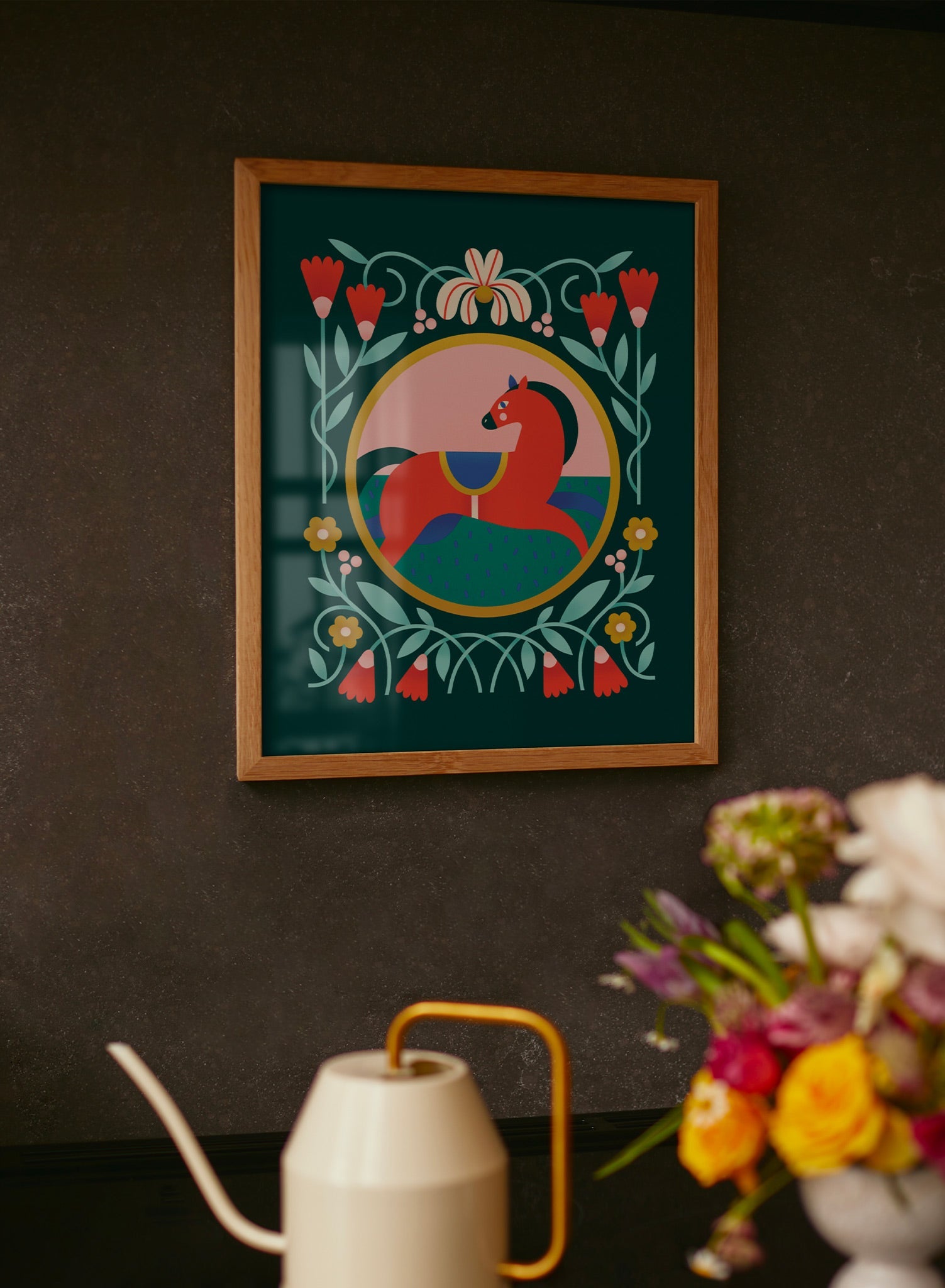 A majestic red horse stands proud within an ornate floral frame, evoking the charm of Scandinavian folk art. Delicate vines, blooming flowers, and golden accents surround the central figure, creating a scene that feels both regal and nostalgic. The deep green background enhances the rich, warm tones, giving the print a bold yet harmonious presence.