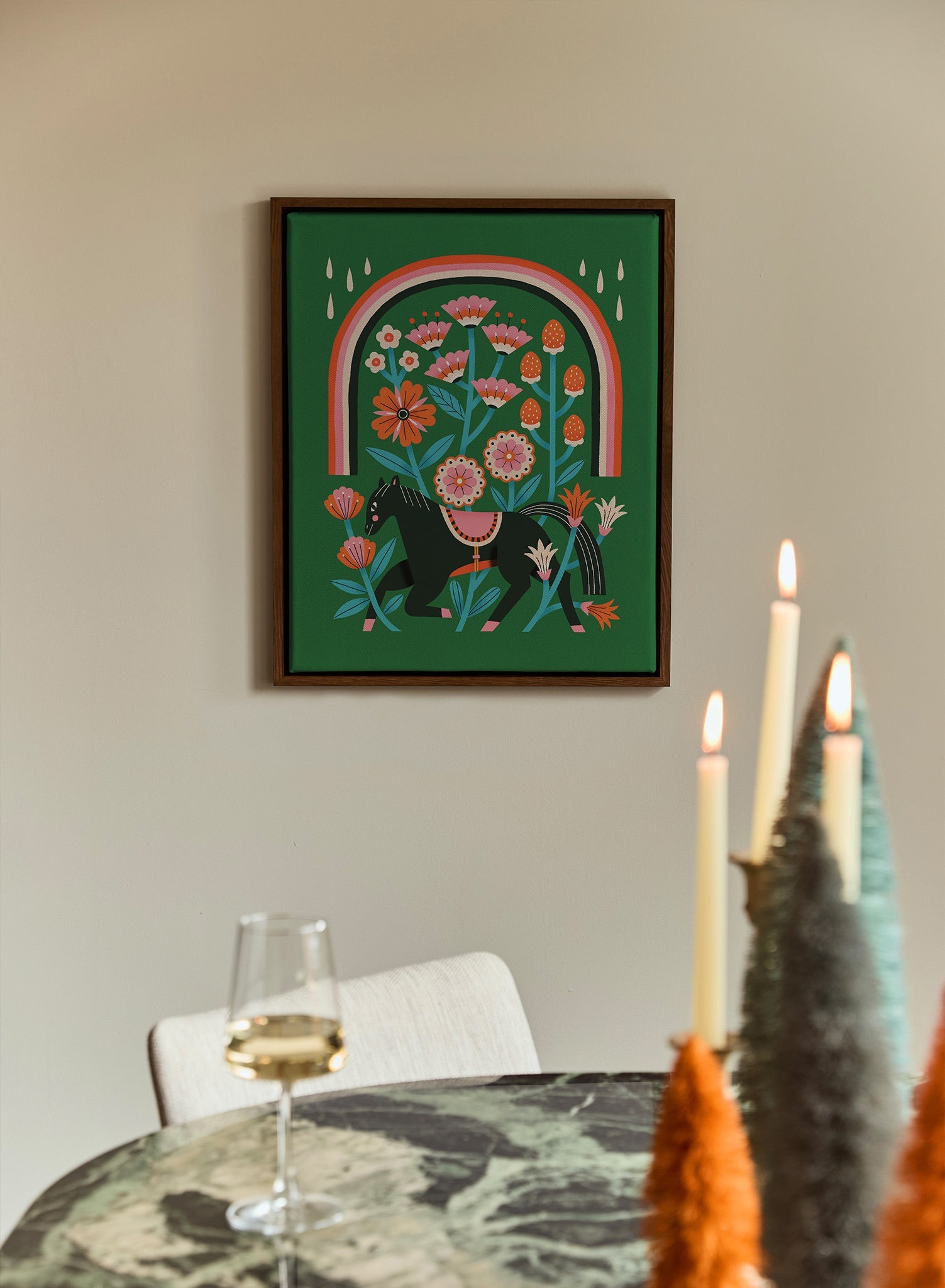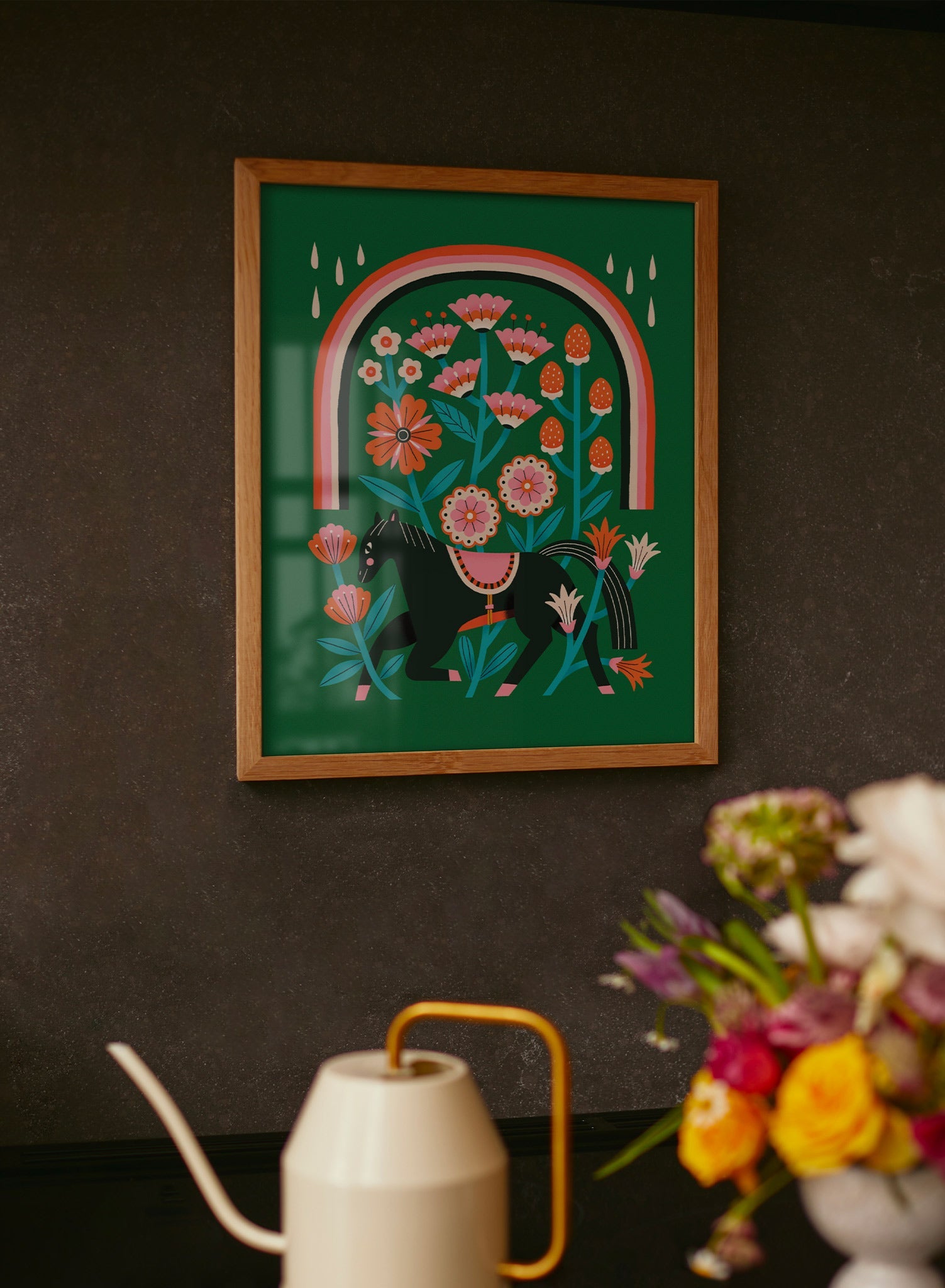 A hidden world of florals and folklore unfolds in this lush, storybook-like scene. A black horse strides gracefully beneath an arch of blooming wildflowers, its presence both grounded and mythical. The deep forest-green backdrop enhances the warm, coral-toned blossoms, creating a striking contrast that feels rich and full of life.