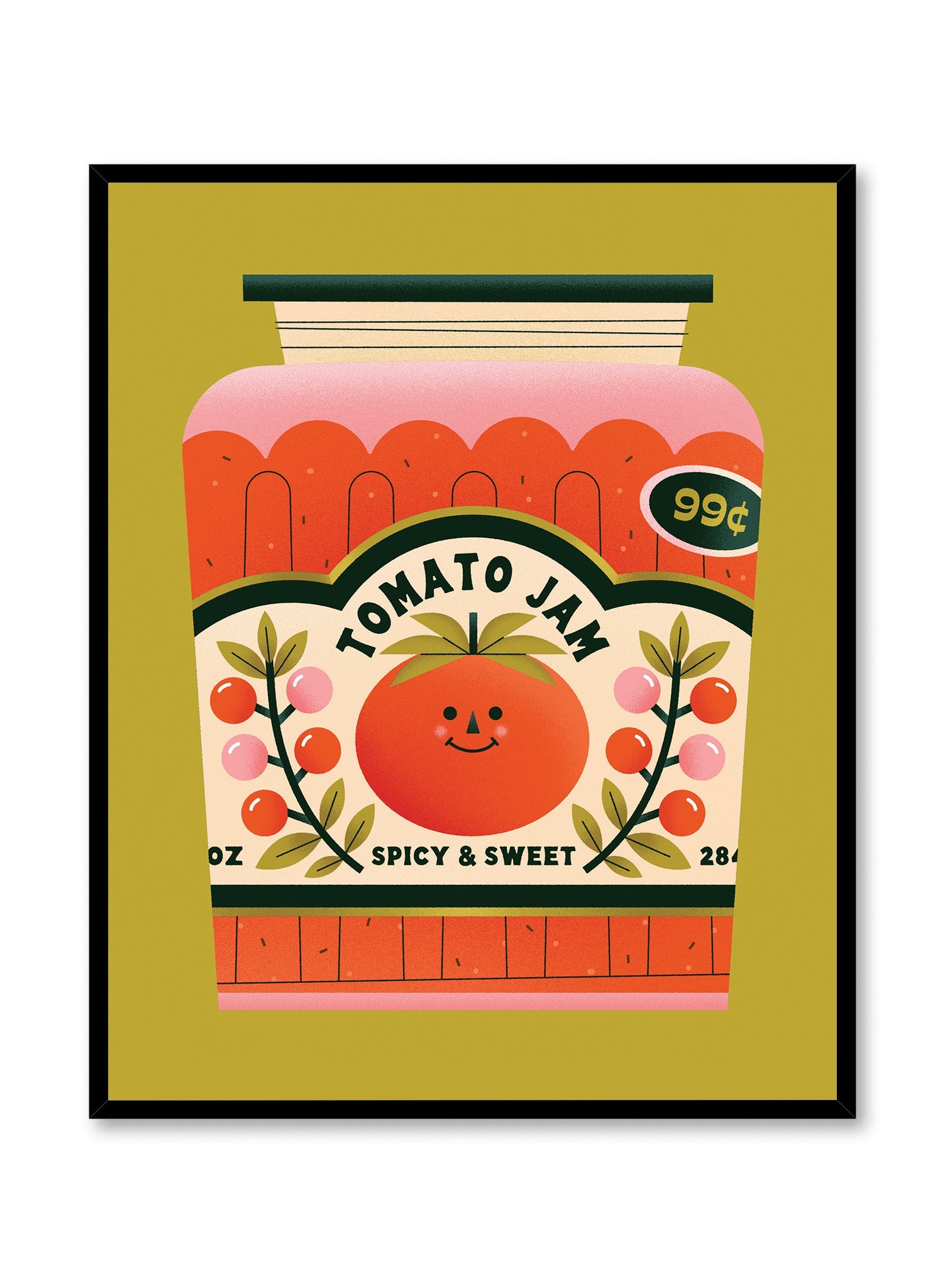 Sweet, spicy, and irresistibly retro—this print brings a playful nod to vintage packaging with a fresh, contemporary twist. A smiling tomato sits at the heart of a charmingly illustrated jam jar, framed by delicate vines of cherry tomatoes and topped with a scalloped lid. The bold, golden-green background makes the nostalgic colors pop, giving it a graphic appeal that’s both classic and quirky.